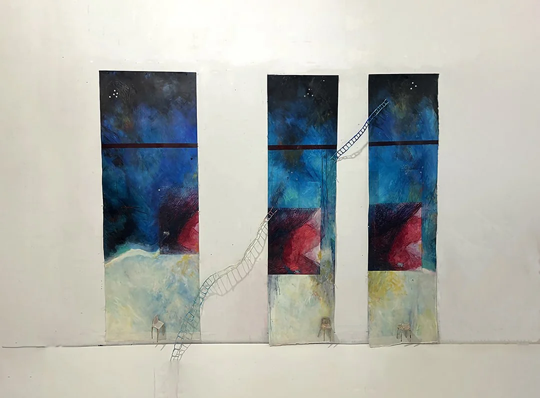 "Somewhere, nowhere, here”, 2025, oil and mixed media on paper, 72x70x7”